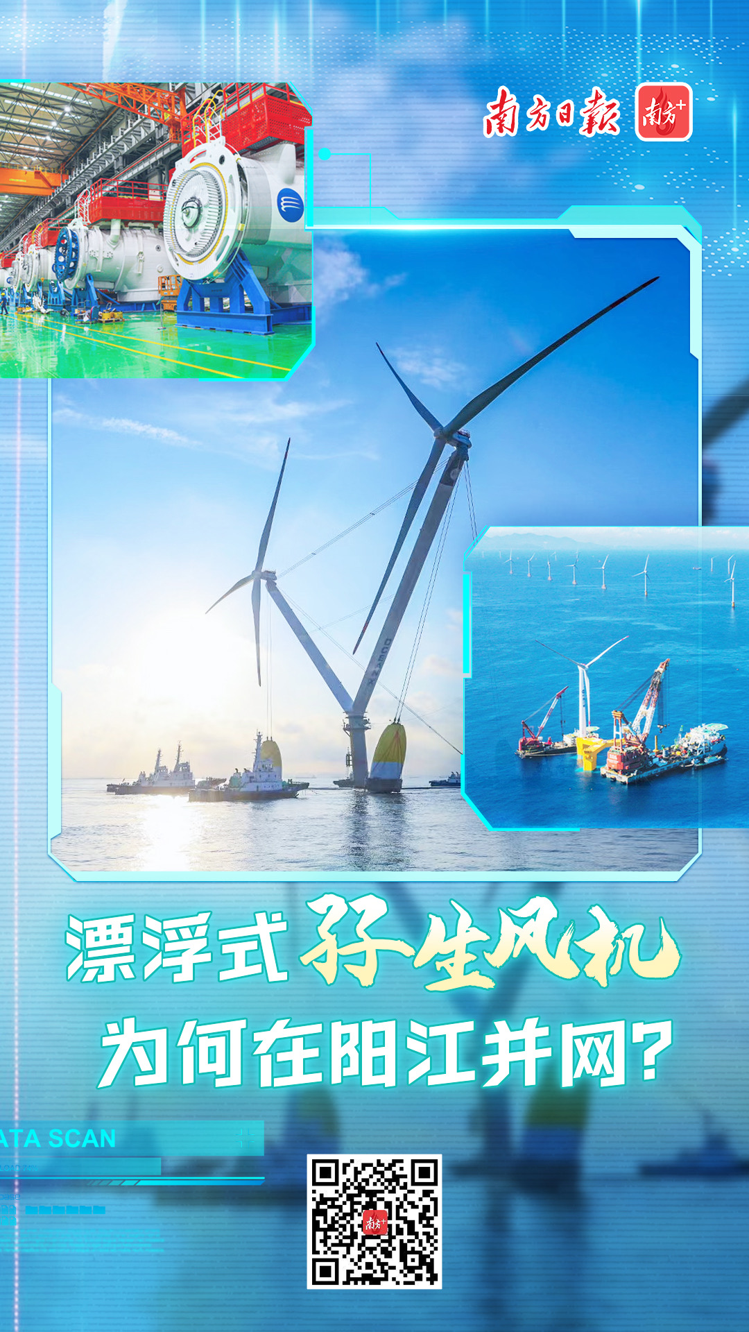 这是全国第5座、阳江第2座投入应用的漂浮式海上风机。阳江,也因此成为探索深远海风力发电的前沿阵地。